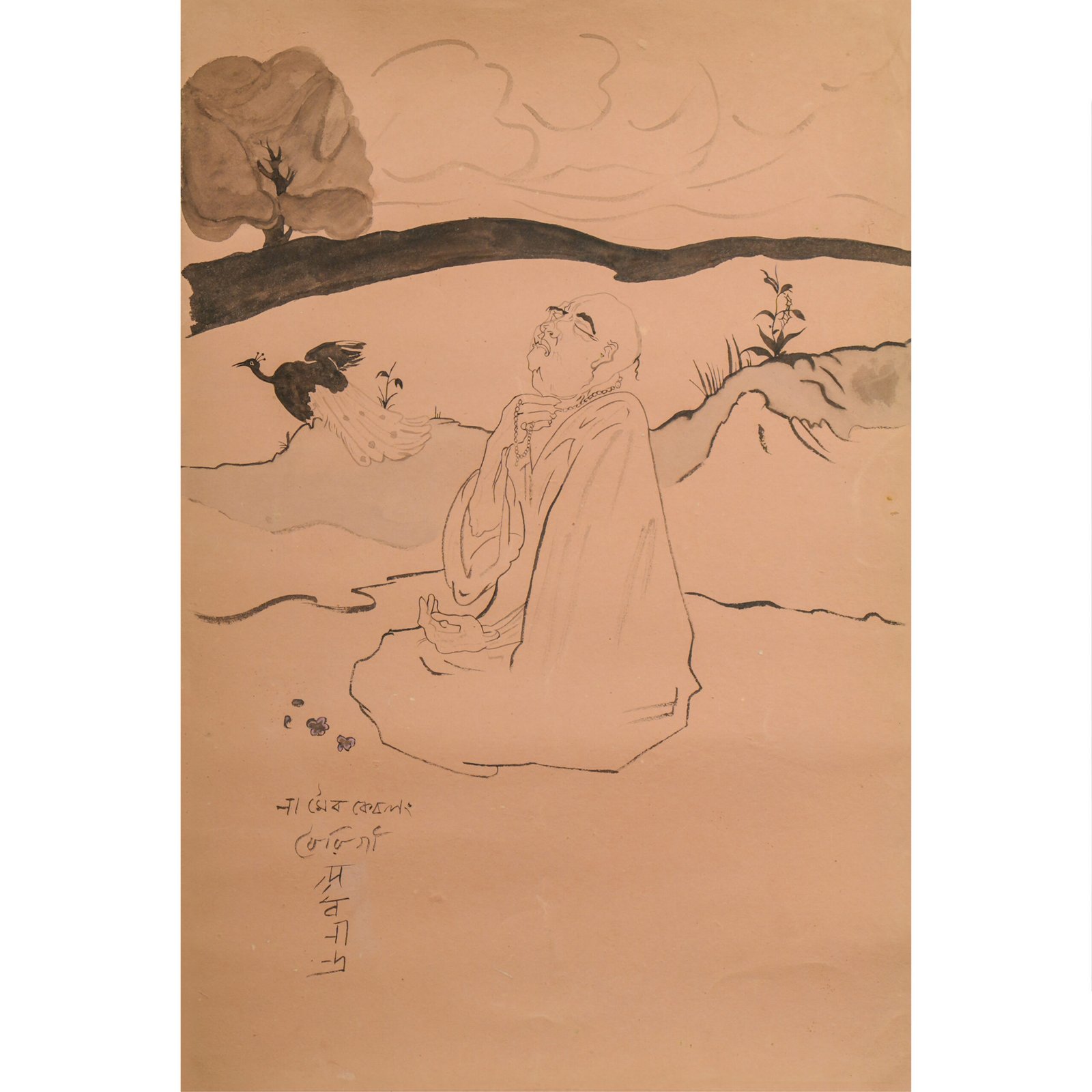 The painting shows a devotee sitting peacefully in a meditative posture. Dressed in a simple long robe, the devotee has their hands clasped in prayer and gazes upward, deep in thought. The setting is calm and beautiful, with a tree in the distance, a small hill in the background, and a peacock walking gracefully in the foreground. The peacock adds charm to the scene and may symbolize spiritual awakening. The sky has soft, wispy clouds, creating a peaceful atmosphere. The painting uses simple lines and shading to convey a feeling of devotion, calmness, and harmony.
