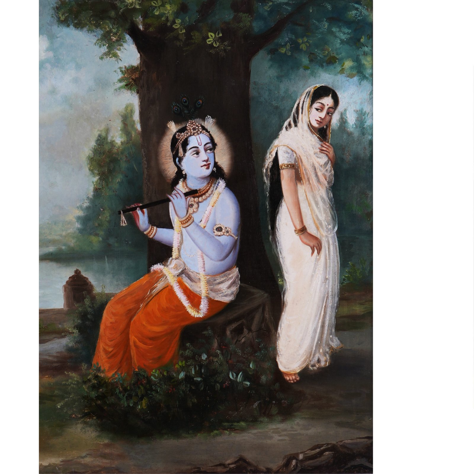 This painting by Allah Bux beautifully captures the serene bond between Krishna and Radha in an natural setting. Radha’s white attire symbolizes purity, while her shy gaze reflects modesty. The vibrant colors, detailed ornamentation, and tranquil lake scene highlight the artist’s craftsmanship and the emotional depth of Hindu cultural themes.