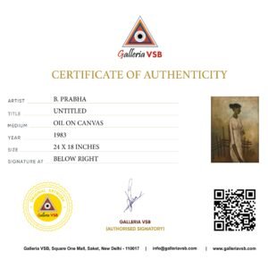B. Prabha’s painting portrays a woman with an elegant, elongated form and a green-hued face symbolizing fertility, holding a flower while anticipating a loved one. Known for her empathy, Prabha’s works highlight themes of motherhood, solitude, and resilience, capturing the emotions and lives of women in rural India with sensitivity.