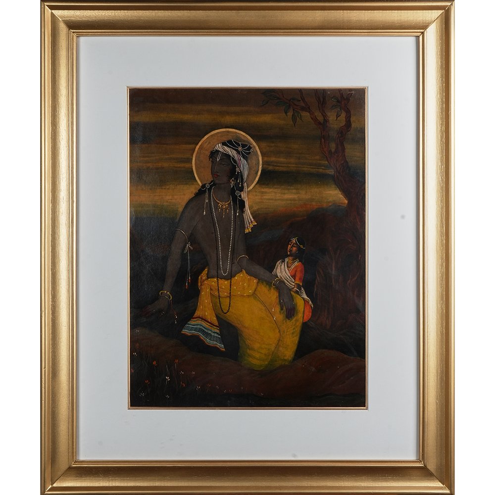 This painting portrays Krishna in a peaceful countryside setting, wearing a yellow dhoti and white turban, with a divine halo around his head. A companion stands beside him, symbolizing devotion. The warm sunset, tree, and earthy color palette evoke spirituality, nature, and divine presence, reflecting Indian miniature art traditions.