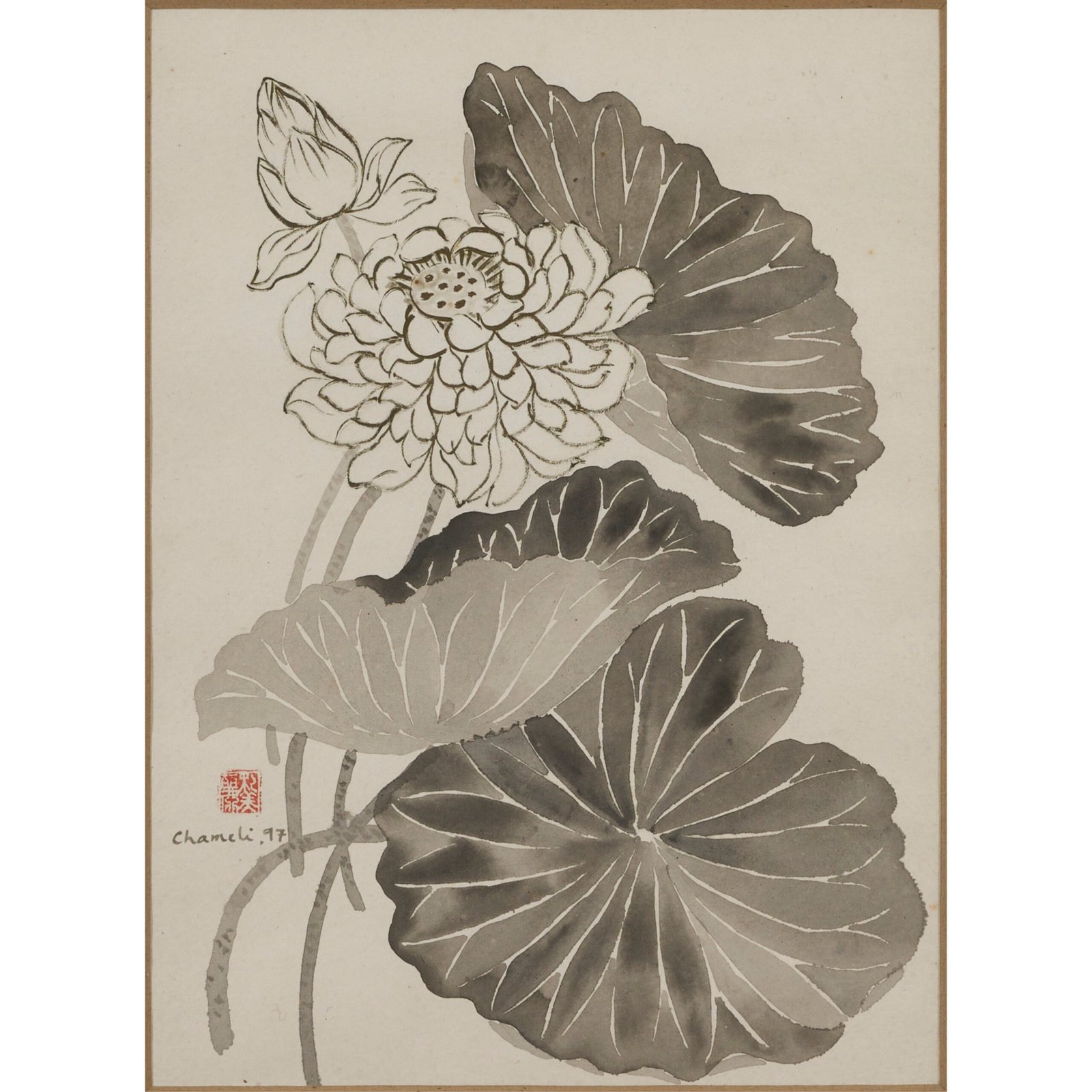 In Chameli Ramchandran’s enchanting painting, delicate brushwork and a traditional Chinese watercolour technique bring to life the exquisite beauty of a lotus flower. The Chinese watercolour technique is often characterised by delicate brushwork, attention to detail, and a traditional approach to depicting subjects like flowers, landscapes, and nature. The paper, thoughtfully utilised on both sides, unfolds a visual symphony of nature’s elegance. The lotus blooms with intricate details, each petal crafted with meticulous brushstrokes. The lotus, a symbol of purity and resilience, stands as a testament to the artist’s dedication to traditional artistry.