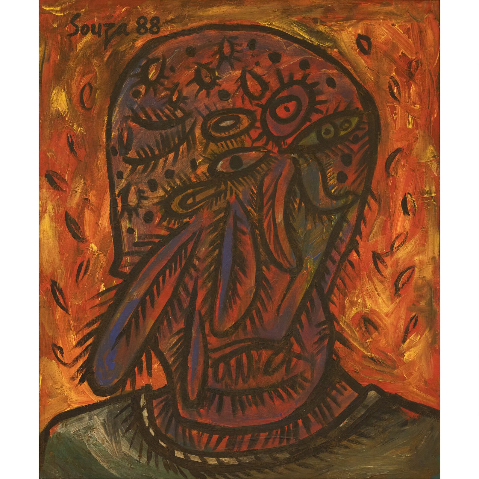This intense painting reflects Souza’s exploration of suffering and anxiety, depicting distorted human forms. His bold style emphasizes raw emotional expression, capturing the complexities of human conditions, such as inner turmoil and spiritual conflict.