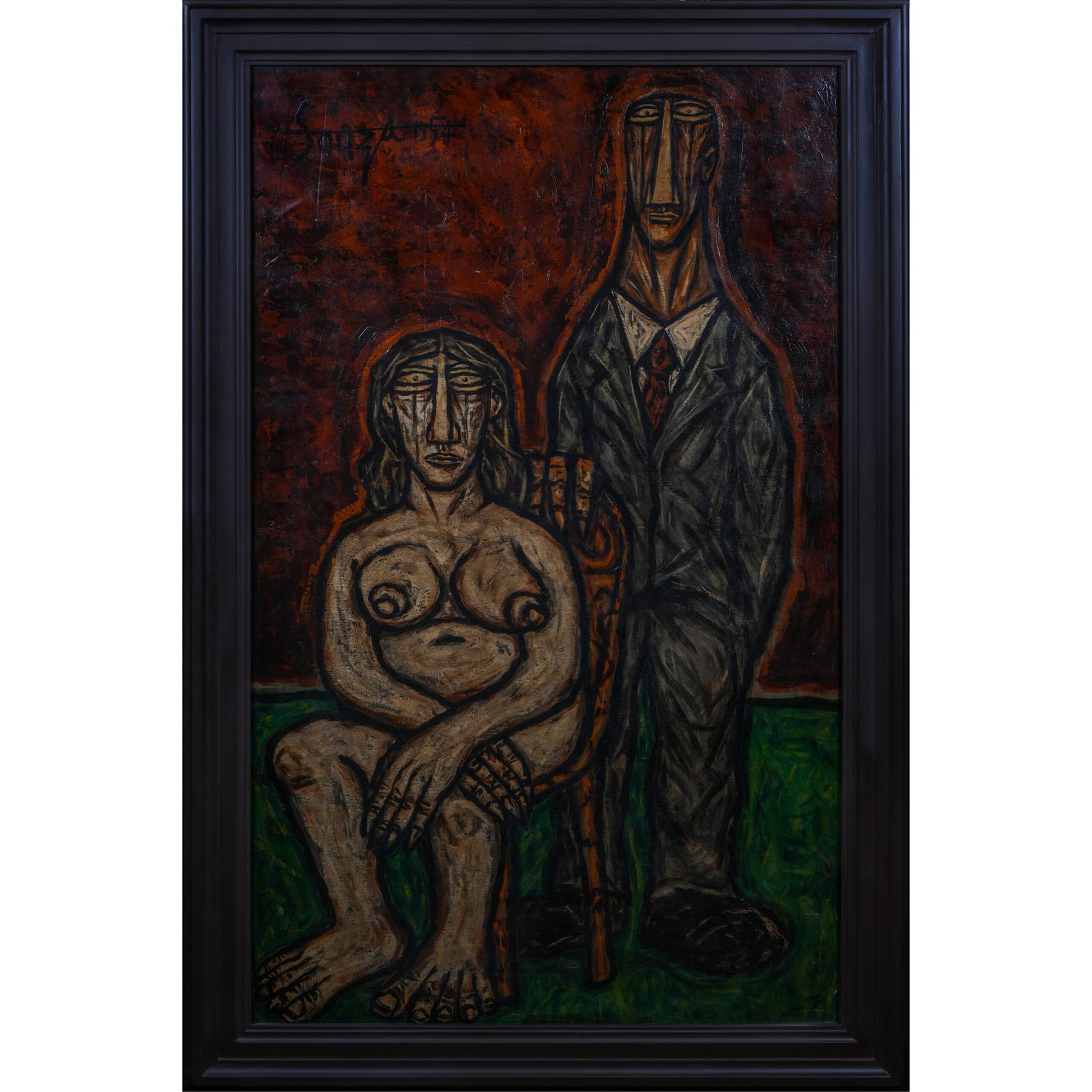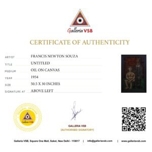 This powerful painting by F. N. Souza shows a strong and emotional scene of a nude woman sitting on chair and a man in a suit is standing painted in Souza’s unique, expressive style. The long bodies, strong outlines, and unusual shapes show his rejection of traditional art rules and social values. The woman looks exposed but confident, while the man appears stiff and controlling—possibly a comment on male power or patriarchy . The bold black lines and rough textures add to the emotion, while the dark orange and brown colors create a feeling of stress, discomfort, or sadness.This painting explores themes of power, control, and isolation, which are common in Souza’s work. The people in the painting are not just characters—they are symbols of human struggle, painted with honesty and sharp insight.