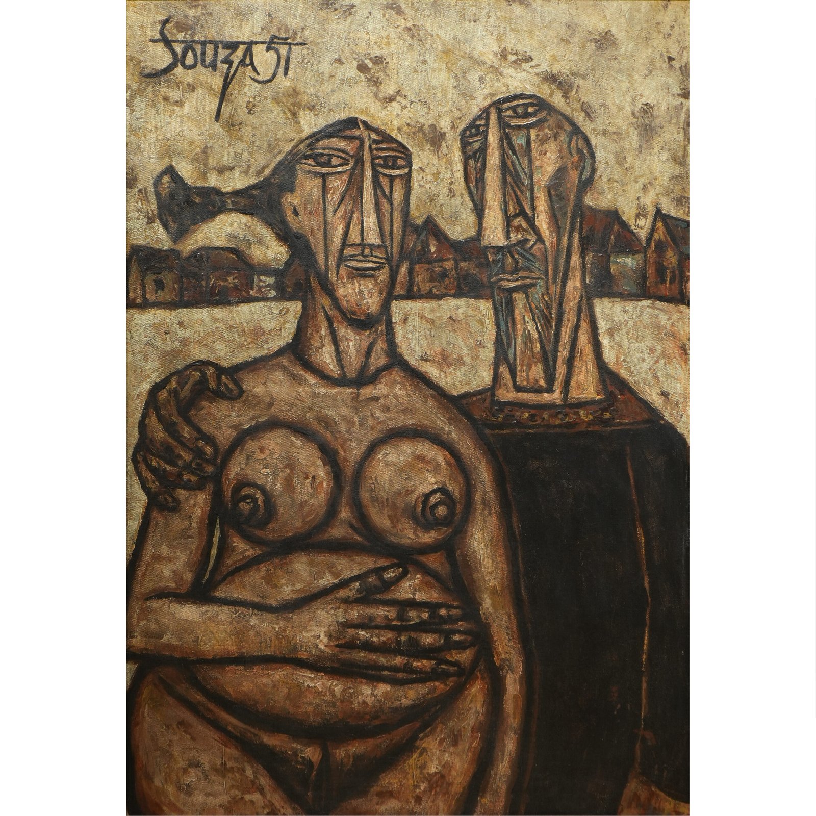 In this painting by Souza, a nude, pregnant woman and a man leave a village, their distorted figures symbolizing society’s rejection of the woman’s body. Her nudity and pregnancy highlight vulnerability and resistance against conservative values. The distorted forms emphasize the clash between personal freedom and societal expectations.