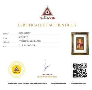 In “Couple”, two female figures are depicted in a stylized and traditional Indian art form, with bold lines, vibrant colours, and simplified yet expressive features. The standing figure on the left wears a shorter, knee-length dress in dark maroon with white decorative patterns along the hem, while the seated figure on the right wears a longer, traditional saree in deep red with intricate white patterns. Both figures have stylized, almond-shaped eyes with sideways glances, round faces, and simplified facial features characteristic of Kalighat art.