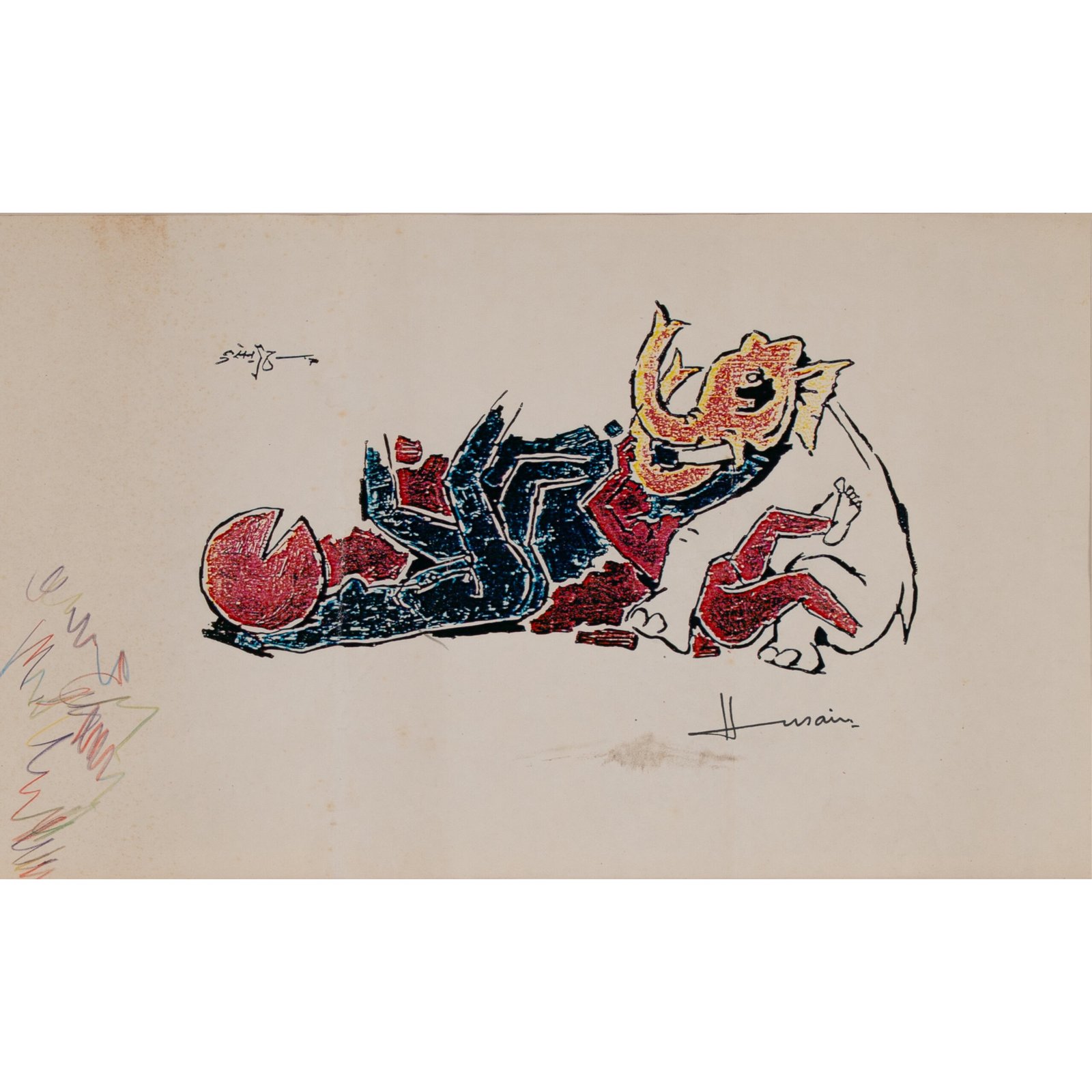 M.F. Husain’s artwork combines the symbolic imagery of an elephant and a reclining figure to represent strength, wisdom, and grace. The bold lines and vibrant colors, like red and blue, convey energy and spirituality. Blending Indian cultural heritage with universal themes, the piece reflects the balance between nature and humanity, focusing on symbolism over realism.
