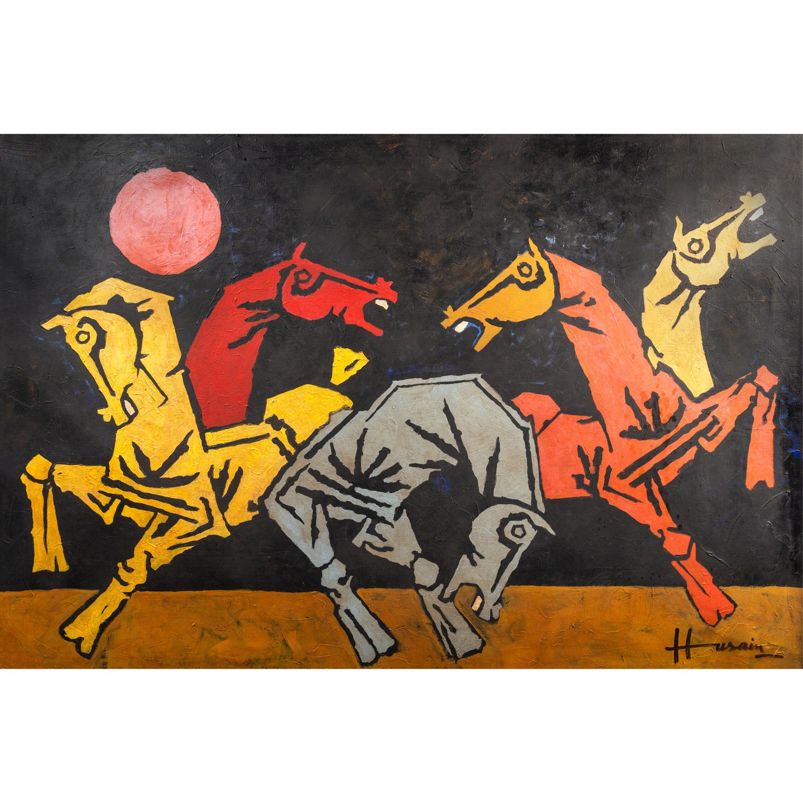 M.F. Husain’s Five Horses depicts dynamic, abstract horses symbolizing strength and freedom, with bold lines and vibrant colors, blending modernist techniques with Indian cultural elements in a powerful, energetic composition.