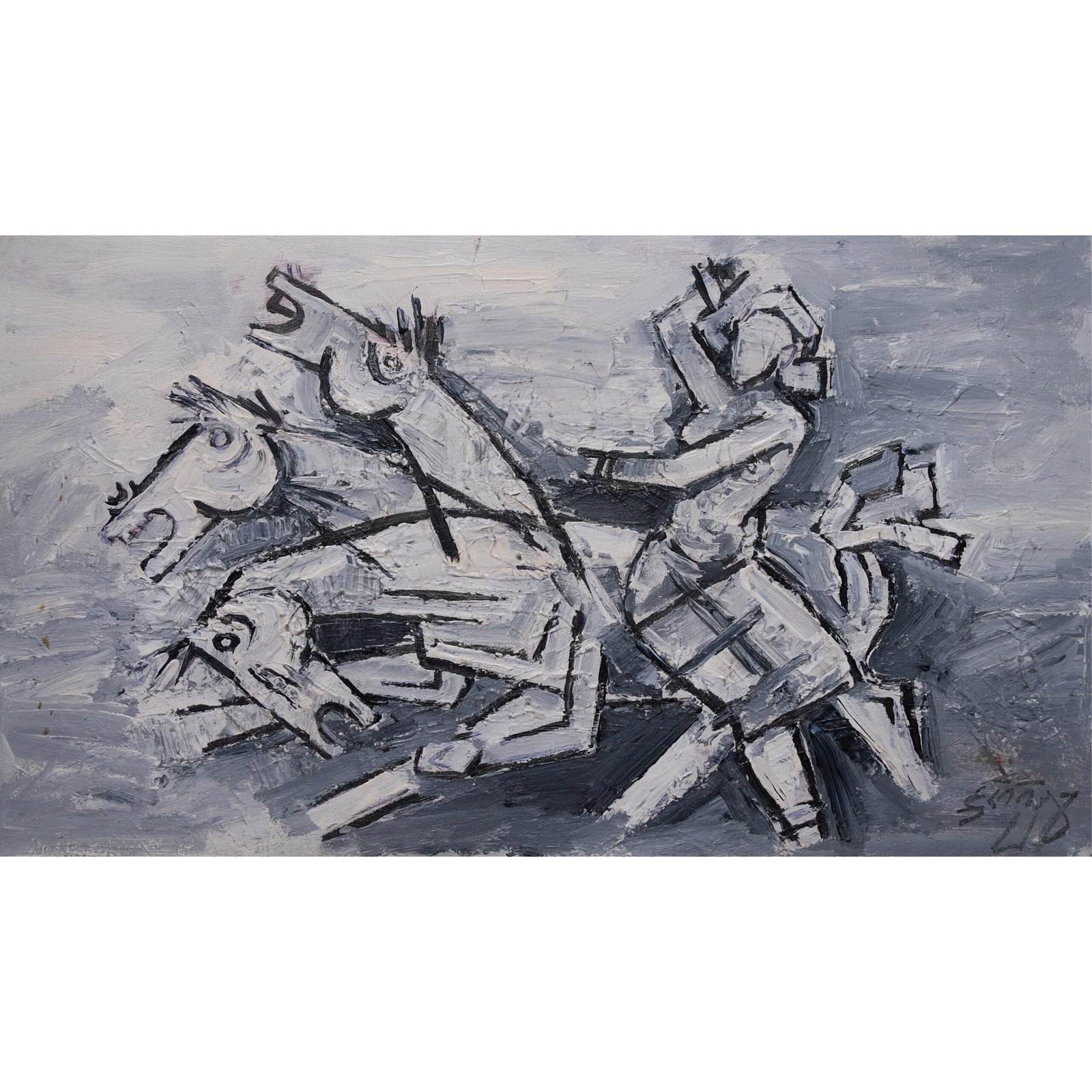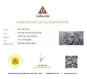 All Rights Reserved. This artwork, titled “Saving the black buck,” is an original piece created by M.F. Husain. All rights to the artwork are owned by the GalleriaVSB. Distribution, display, or any other form of unauthorized use of this artwork is prohibited.