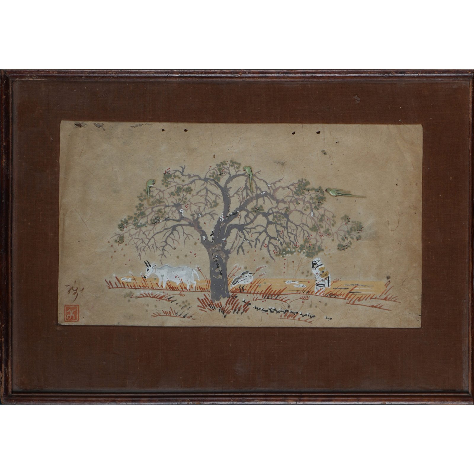 The artist masterfully captures the essence of rural life, blending simplicity with poetic beauty. The composition unfolds near the banks of a river or lake, where everyday moments are woven into a harmonious visual story. A lone tree stands gracefully, its branches offering a resting place for parrots, adding a touch of life and movement to the stillness of nature.