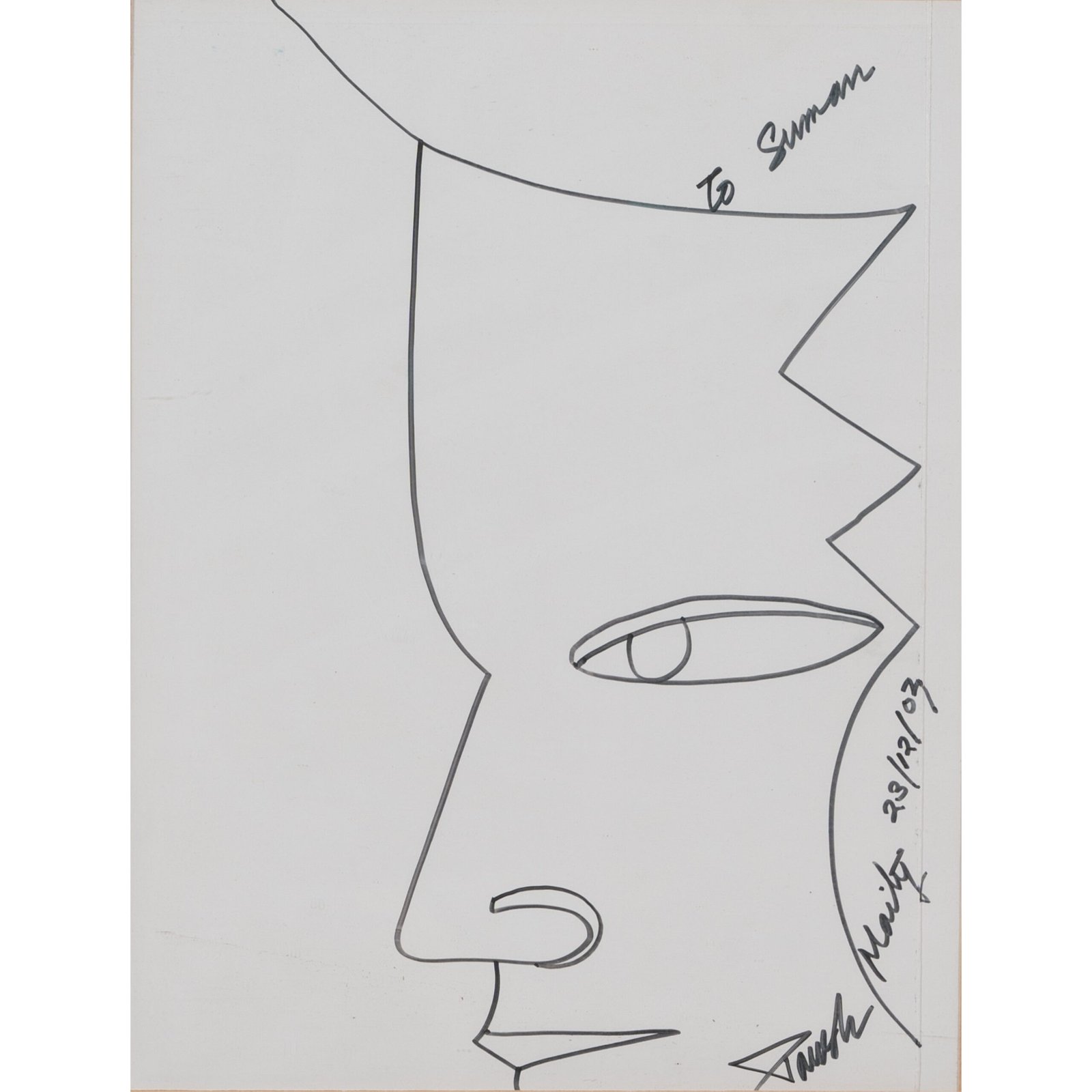 The artwork presents a side profile of a human face, drawn with clean, angular, and curved lines. The sharp zig-zag edges at the chin suggest abstraction over realism. Maity’s crisp, deliberate lines showcase his control, highlighting the balance between form and meaning in abstract art.