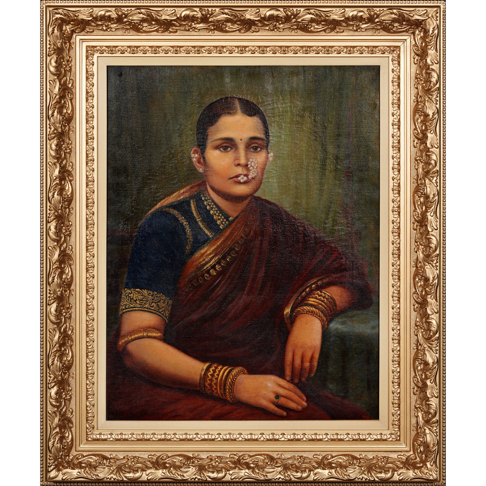 Draped in an exquisitely woven saree, its folds rendered with meticulous detail, Maharani Chimnabai embodies the essence of royalty and refinement. Her ornate jewelry glistens softly, a testament to her status, while her expression—serene yet commanding—captures the depth of her character. The subtle interplay of light and shadow breathes life into the portrait, enhancing the delicate contours of her face, the gentle drape of fabric, and the quiet strength in her gaze. Varma’s brushwork, both soft and precise, brings out the textures of silk and gold, the glow of skin, and the richness of her adornments, making her presence almost tangible. The carefully muted background allows her regal form to stand out, ensuring that all attention is drawn to her dignified posture and luminous presence.