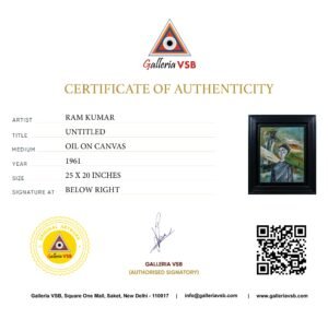 This painting by Ram Kumar portrays a solitary, ghostly figure set against an abstract, emotionally charged landscape. Echoing the psychological depth of The Scream, the figure’s hollow eyes and still expression reflect profound alienation. The swirling, fragmented background intensifies the sense of dislocation, mirroring inner turmoil. Blending figuration with abstraction, Ram Kumar transforms the scene into a meditation on loneliness and existential detachment, capturing a quiet yet powerful emotional scream.