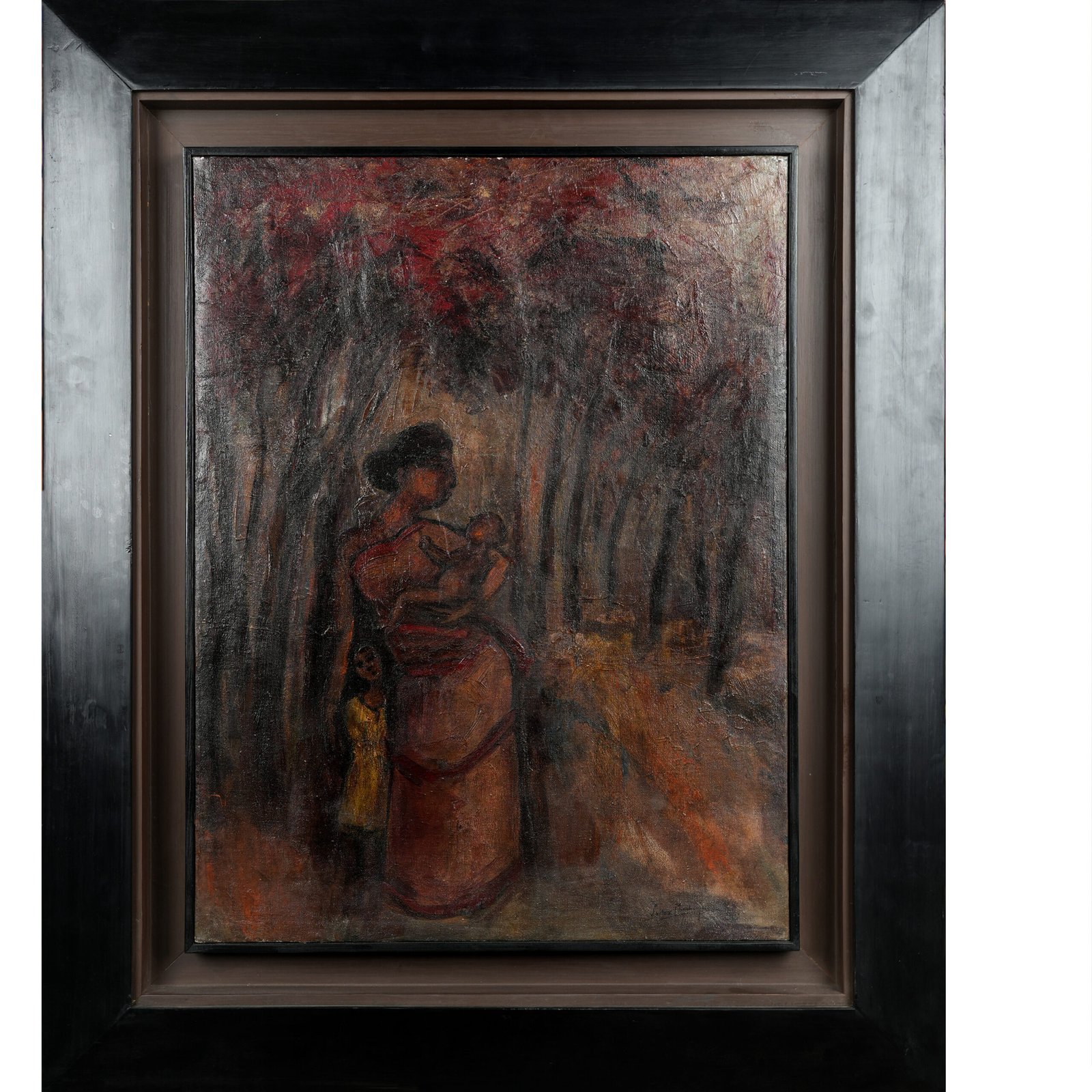 The central figure—a woman leaning against a tree—exudes a sense of quiet patience and anticipation. Holding her baby on her waist while a young girl stands beside her, she represents the everyday struggles and responsibilities of a rural mother. The act of collecting dry wood signifies her daily chores, essential for sustaining her household. Mookherjea’s use of earthy tones and fluid lines enhances the emotional depth of the scene, bringing out a sense of warmth and familiarity.
