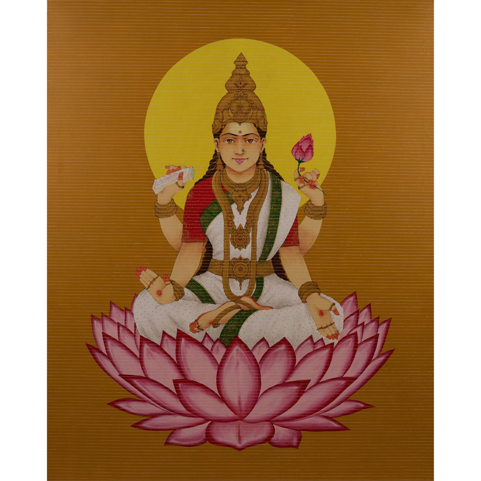 The radiant goddess of knowledge, Vidya Lakshmi, bestows the gifts of creativity, wisdom, and expertise in arts, sciences, and all facets of life. She is often depicted seated on a lotus, radiating a serene and luminous aura, symbolizing purity and enlightenment. Adorned with intricate ornaments and a crown, she holds sacred texts and a lotus flower, signifying the pursuit of knowledge and spiritual growth. Her tranquil expression inspires seekers to delve deeper into their intellect and intuition. The background often features vibrant scrolls, musical instruments, and symbols of learning, reflecting her role in unlocking the vast potential of the human mind and guiding the realization of one’s true worth